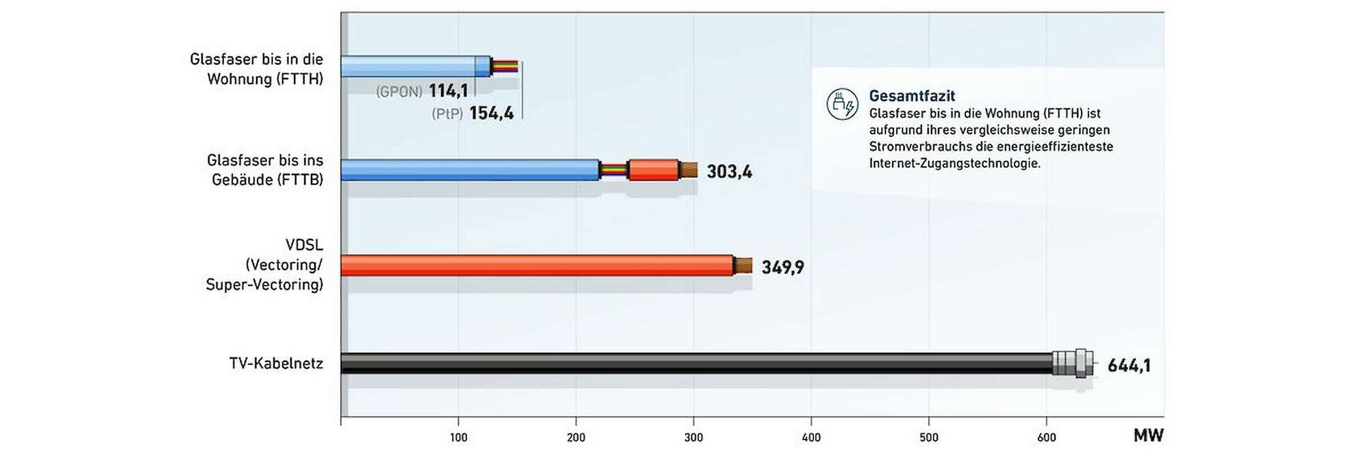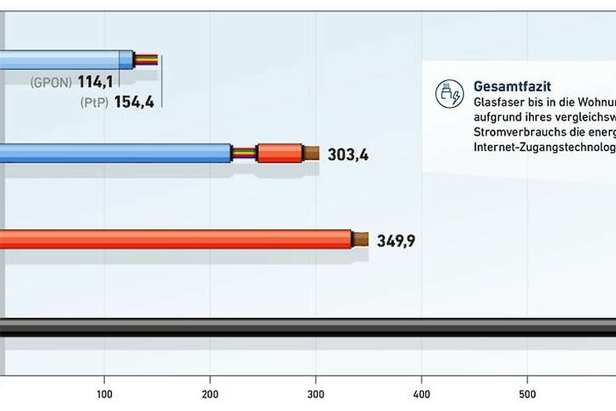 Hochgerechnet auf die flächendeckende Versorgung Deutschlands hätten reine Glasfasernetze (FTTH) einen Stromverbrauch von 154 Megawatt. Zum Vergleich: Kupferbasierte Netze (FTTC) benötigen im gleichen Szenario 350 Megawatt und TV- Kabelnetze 650 Megawatt. Gegenüber TV-Kabelnetzen ließen sich mit Glasfaser demnach 496 Megawatt einsparen. Das entspricht mehr als 50 Prozent der Leistung des Braunkohlekraftwerks Schkopau in Sachsen-Anhalt. Durch Optimierungen der Hardware- Komponenten, beispielsweise der Router, lässt sich der Stromverbrauch weiter senken.